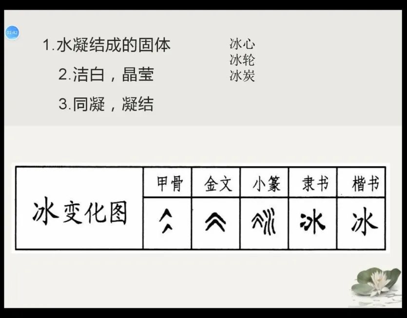 當接到“漢字小講堂”的任務時,半是無措半是驚喜。因對漢字的了解僅僅浮于表面,卻對内在的邏輯與美學所知甚少而不知所措;也因終于得了與同學一起研究其本源并分享的機會而驚喜。大抵是因為來自名字的親切與莊嚴感,我的小講堂選的内容是兩點水和三點水。兩點水來自于冰,而三點水起源于水。雖則手頭資料不多,但查找的過程總是欣喜的。一則本身崇尚“上善若水”的智慧而喜愛冰的晶瑩幹淨,二來對漢字這條民族的生命線充滿尊重與好奇,三便是想到父母取名時的良苦用心。冰玉代指高尚的人品,冰壺是潔白純淨...我從不知這樣一個普通的字後邊卻有這般深意。一個幼小的生命甚至還沒有意識,就有這樣豐富而含蓄的愛以姓名的模樣包裹着他,應當隻有漢字能做到了。